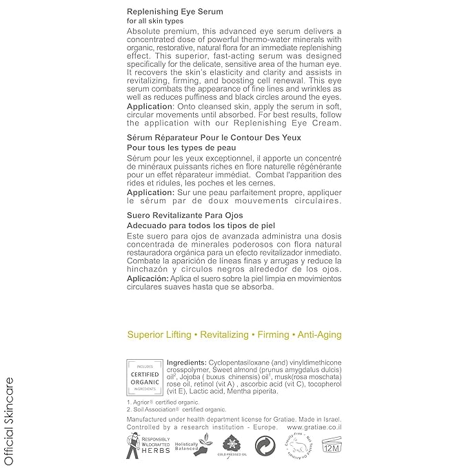 - đ± LIFTING COLLECTION: GRATIAE REPLENISHING EYE SERUM is an advanced hypoallergenic, daily use anti aging skincare. This silky, smooth anti-aging eye serum is made with organic jojoba oil, organic sweet almond oil, rose hips oil, vitamin C, vitamin E oil and retinol, helping to treat fine lines, wrinkles, crowâs feet and dark circles for s smoother brightened more unified skin appearance. This anti aging eye serum is perfect for all skin types, especially sensitive, dry, and allergy-prone skin.