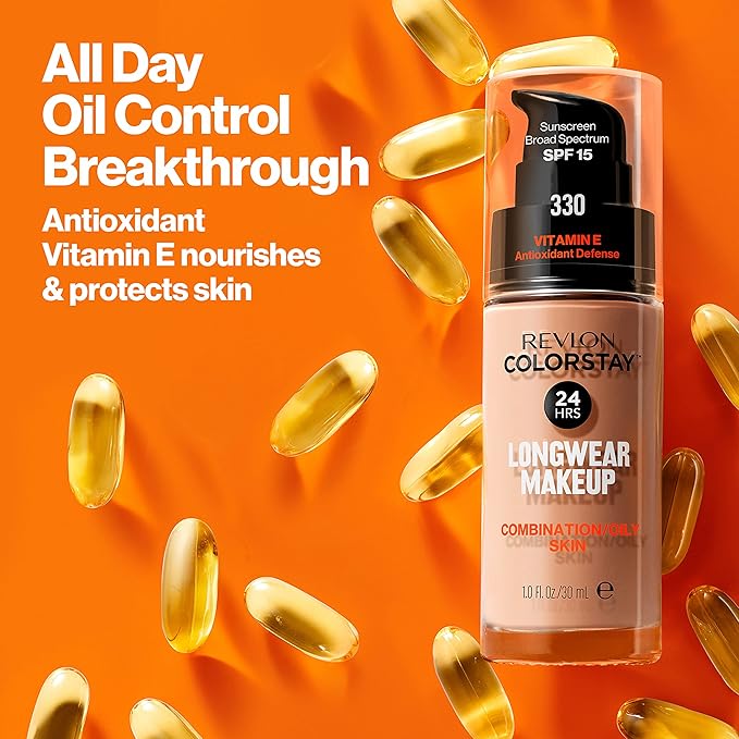 Revlon Liquid Foundation, ColorStay Face Makeup for Combination & Oily Skin, SPF 15, Medium-Full Coverage with Matte Finish, Honey Beige (455), 1.0 oz