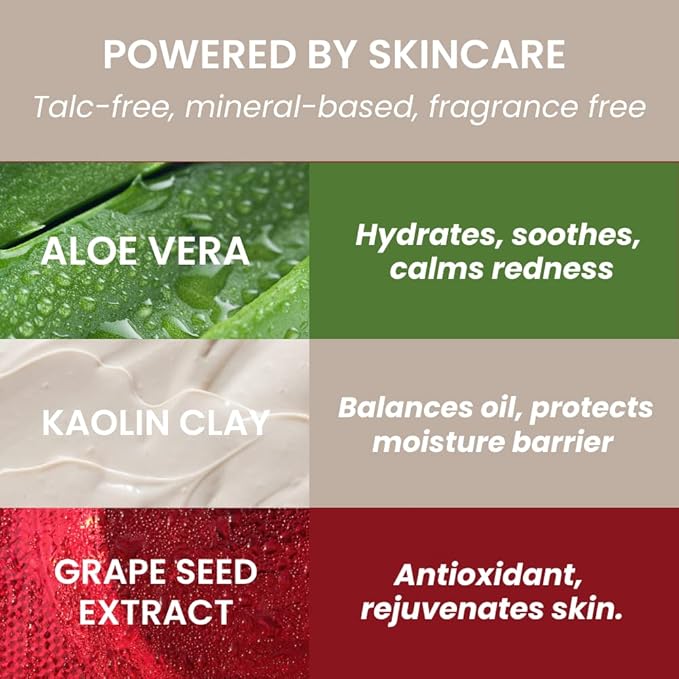 - Packed with Natural Skincare Ingredients: Ideal for all skin types, this featherweight powder features botanical extracts like skin-soothing Aloe Vera, rejuvenating Grape extract, and oil-balancing Kaolin Clay