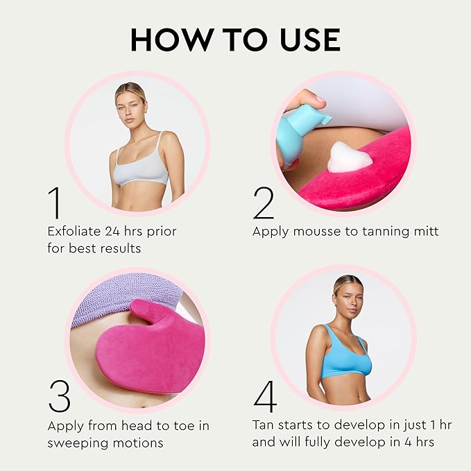 - Self-tanning mousse develops in 1-3 hours and dries quickly without an orange tone. Apply with a tanning mitt and leave on longer for a deeper, customizable bronzy glow