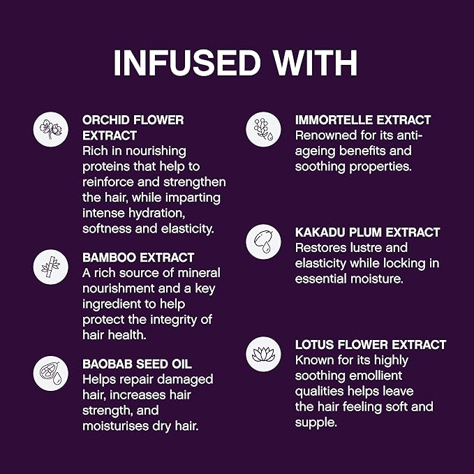 - Hair Hydration Ingredients: Formulated with Amino Acids, Baobab Seed Oil, and Orchid Flower Extract, this hair treatment strengthens, softens, and restores ageing hair