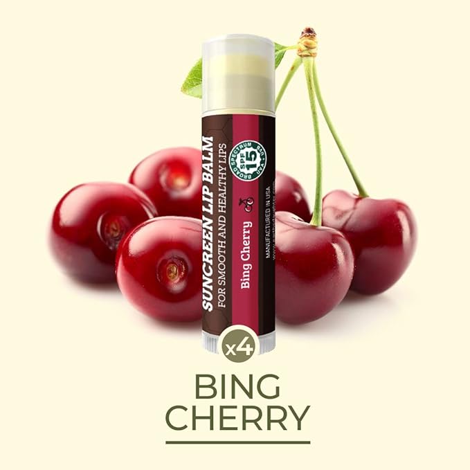 - 4 PACK of SPF 15 SUNSCREEN LIP BALM – Delicious Cherry Flavor. Everyone loves our cherry lip balm with SPF 15 sun protection, organic beeswax, organic coconut oil and other premium organic hydrating ingredients to protect and moisturize all day long. Our lip balm is great for everyday protection and safe for the whole family