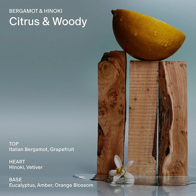 - Bergamot & Hinoki — This scent is citrus, woody, and awakening. It’s sparkling and energizing, like a crisp morning spent at a luxury outdoor spa.