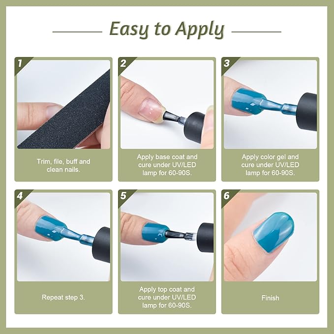 - Healthy and Long Lasting: Natural resins, minerals, and professional formula create our gel nail polish. It is safe to use . Under the curing of nail lamp, it can keep about 21 days of effect, the color is still obvious.