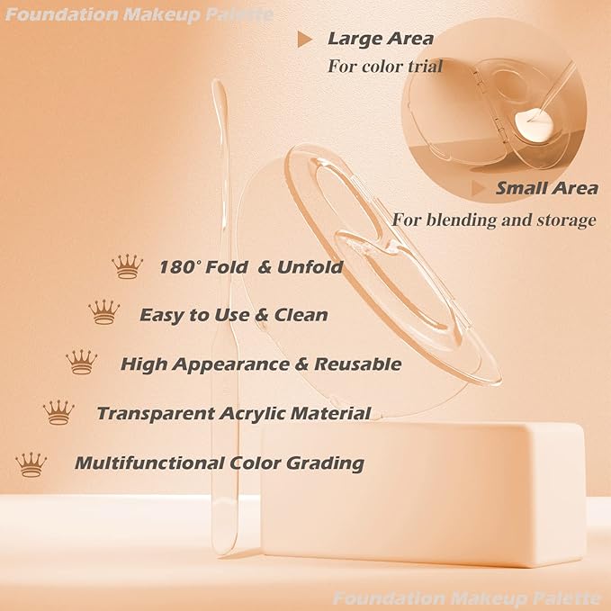 - đăFolding DesignăTransparent makeup palette can be unfolded and folded at 180 degrees, and the folded storage takes up less space. Acrylic empty palette can store liquid foundation and concealer for up to 24 hours without contamination.