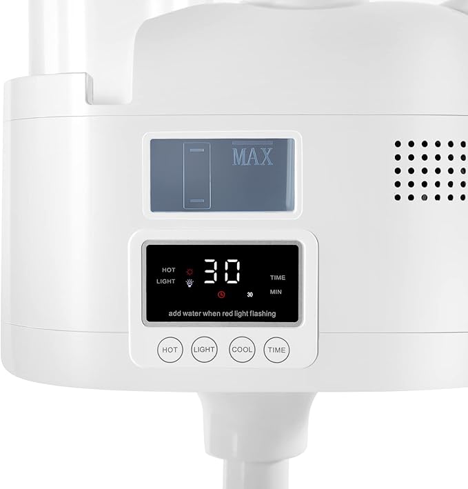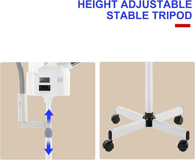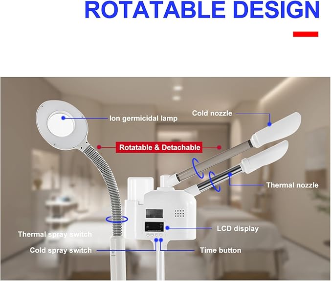 - 【Convenient Design】: Adjustable height and rotating nozzle to any angle you need, the nozzle of the steamer esthetician can be rotated 360 degrees, there is a diffuser in the mouth of the nozzle, you can put the diffuser in it to use it, 4 low-noise wheels can be moved freely to any place, there is an LCD display, easy to control. Also has 10 minutes, 20 minutes, and 30 minutes of timing according to their own time freely adjustable.