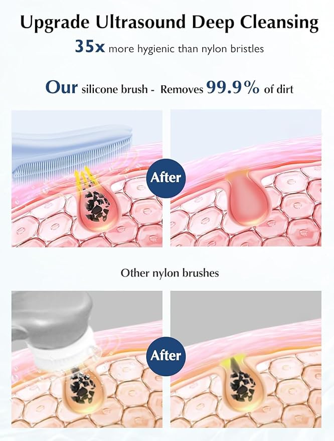 - 4 CLEANSING MODES AND EYE FUNCTION: The portable face cleansing brush device has 4 cleaning modes, easily meeting different cleaning needs, making your skin clearer more vibrant. The innovative triangular constant temperature 40° heating zone on the back effectively improves in the eye area, lift the corners of the eyes