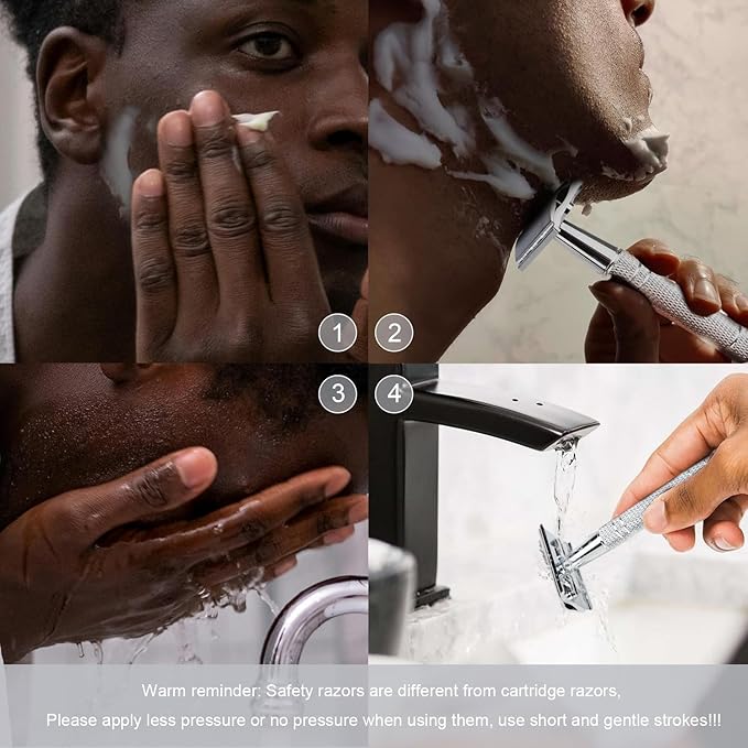 - Sensitive Skin Friendly & Reduces Ingrown Hairs: Say goodbye to razor burns! Gentle yet effective, this double edge safety razor is suitable for all skin types. The safety razor features a single blade that minimizes friction, avoiding the skin damage caused by multiple blades coming into contact with the skin, effectively reducing the risk of follicle damage, making it ideal for sensitive skin
