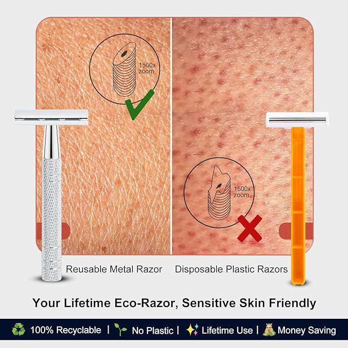 - Eco-Conscious & Built to Last: Shaving with our reusable metal safety razor - a zero-waste essential for eco-friendly shaving. Crafted from long-lasting, fully recyclable metal, this vintage-inspired double edge razor saves money and reduces environmental impact. With the right care and maintenance, it can last a life, aligning with sustainable lifestyles. (No parts to replace, just replace standard safety razor blades) Change the way you shave, choose our single blade razors for men and women