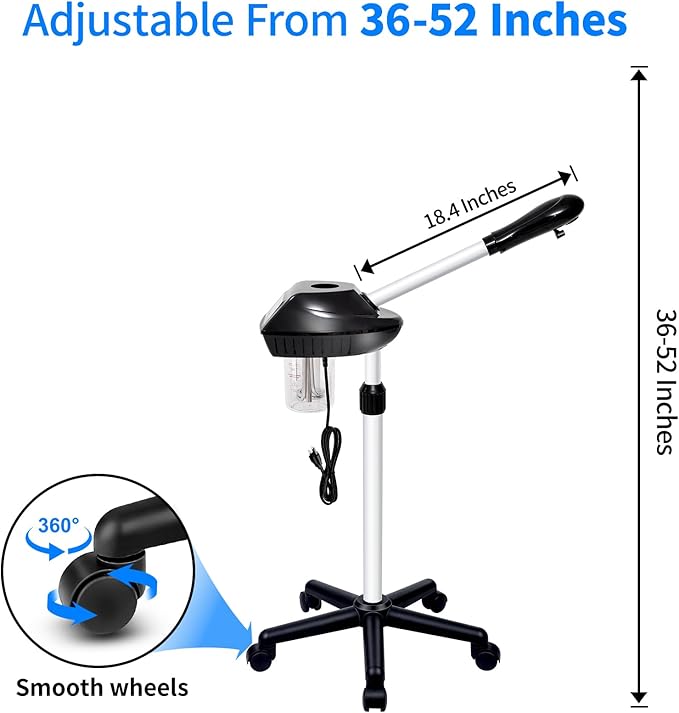 - 【Facial Steamer Adjustable】This height of this face steamer for facial deep cleaning can be adjusted from 36~52 inches, with a 360° rotated nozzle and a 360° rotated main body, 360° rotatable wheels, which is very suitable for spa or home personal care.