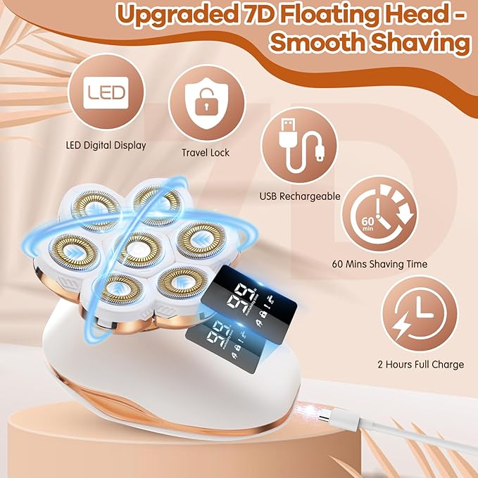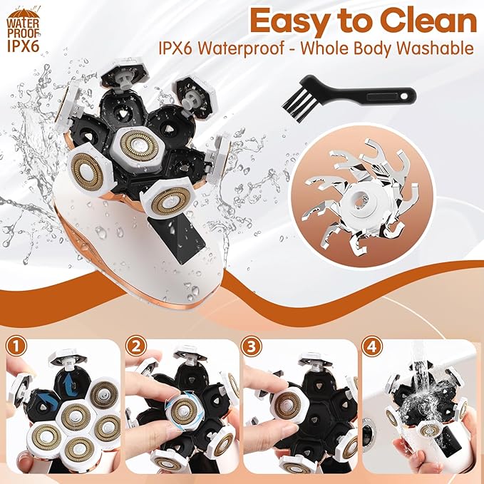 - 【Upgraded 7D Floating Blades】Compared with other 5D floating blades, our 7D wrap-around floating blades allow our women's razor to automatically adapt to the contours of your hands, legs, head, face, neck and even chin. Providing you with a comfortable and efficient shaving experience. Rounded head design is acne-friendly and perfectly protects skin from nicks and cuts. 360°Gentle, painless and clean hair removal.