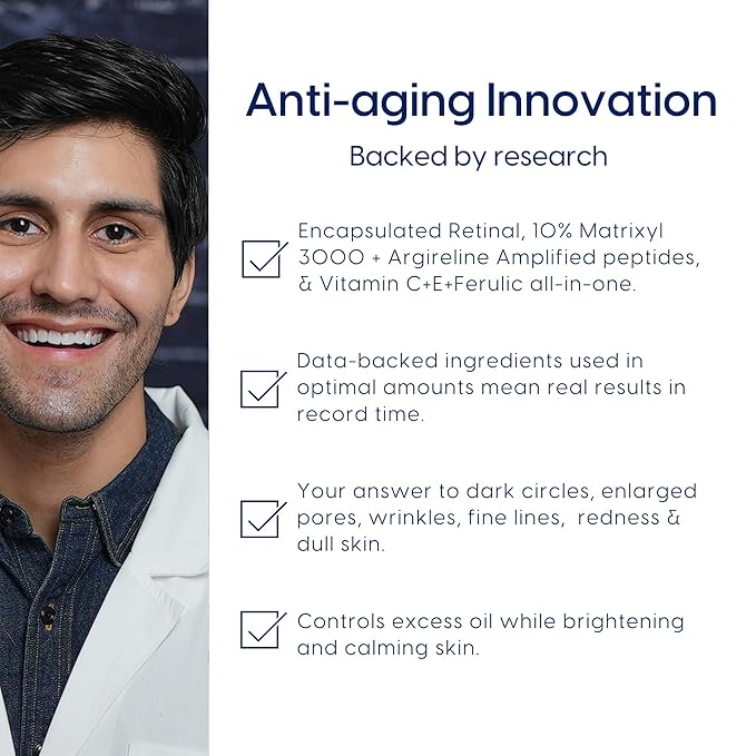 - True Anti-aging Innovation: No other brand packs this in one formula 0.1% Encapsulated Retinal, 10% Matrixyl 3000 & Argireline Amplified Peptides + Tetra C make this the new gold standard.