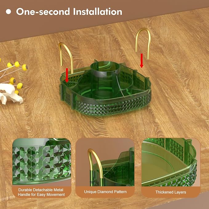 - Multifunction:➤The spinning organizer can be used to store cosmetics, such as:perfume, brushes,nail polish, lipstick,eye shadow,makeup powder, or store bathroom supplies, such as:toothbrush, toothpaste,razor,body lotion.You can use non-compartmented plates as food display plate to store vegetables, fruits, pastries, snacks, etc, or store condiments.