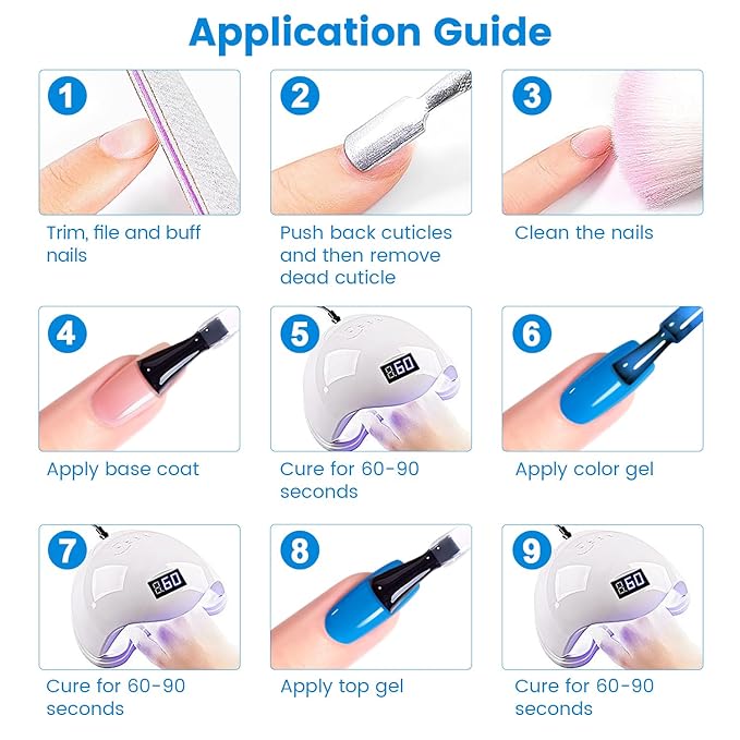 - Included Components : 6 bottles of gel nail polish, UV/LED nail dryer lamp, gel base coat top coat