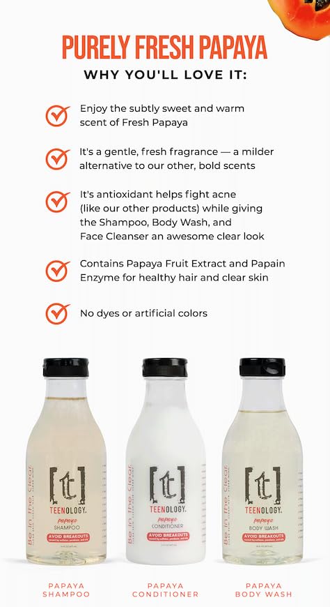 Teenology Shampoo for Teens - Avoid Forehead and Body Acne - No Sulfates or Parabens, Noncomedogenic, Natural Botanical Extracts, 16 oz. (Fresh Papaya)