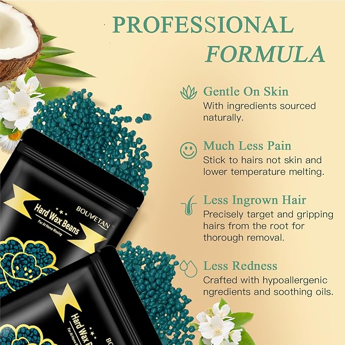 - 【Waxing Beads for Sensitive Skin】BOUVETAN hard wax beans are specifically formulated with hypoallergenic ingredients. They are meticulously designed for sensitive areas hair removal like the bikini line and underarms