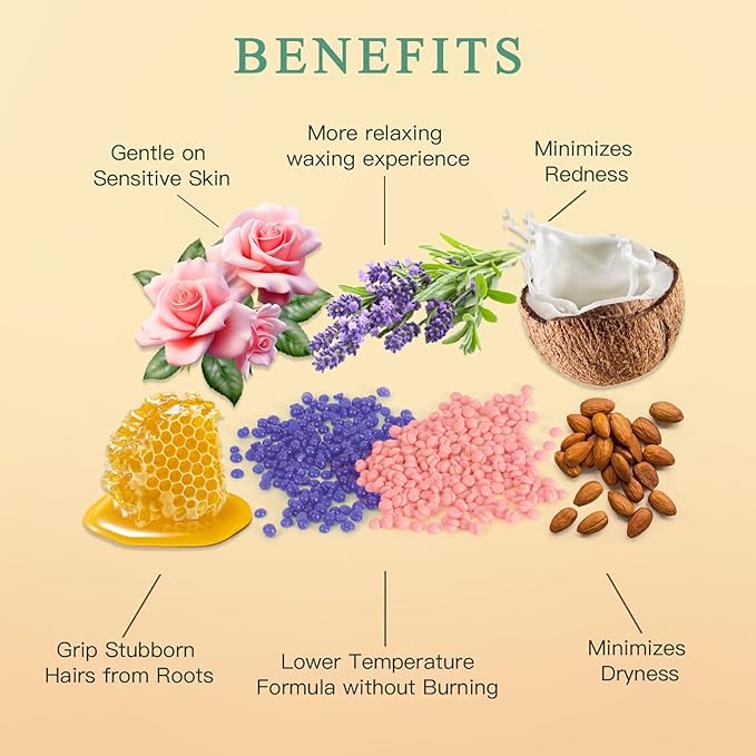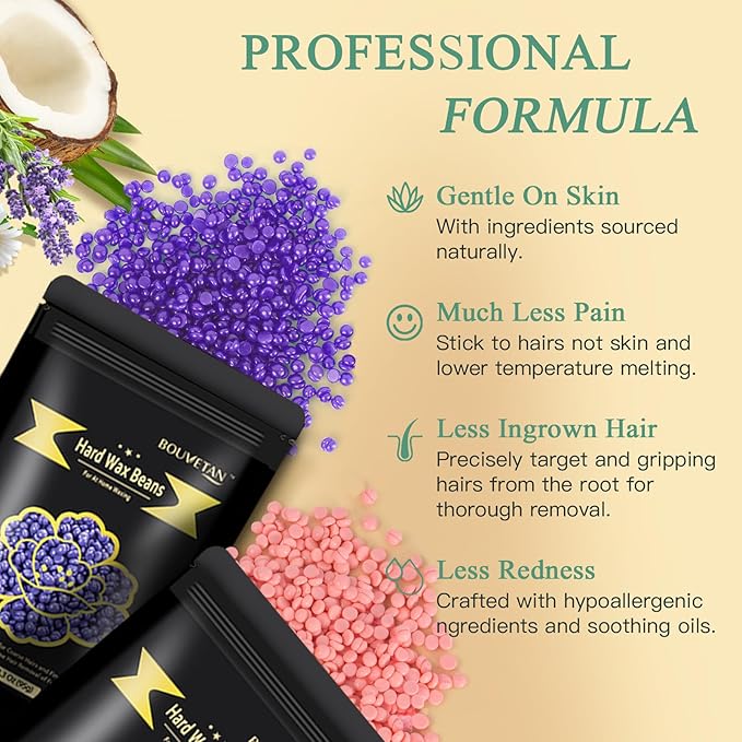 - 【Waxing Beads for Sensitive Skin】BOUVETAN hard wax beans are specifically formulated with hypoallergenic ingredients. They are meticulously designed for sensitive areas hair removal like the bikini line and underarms