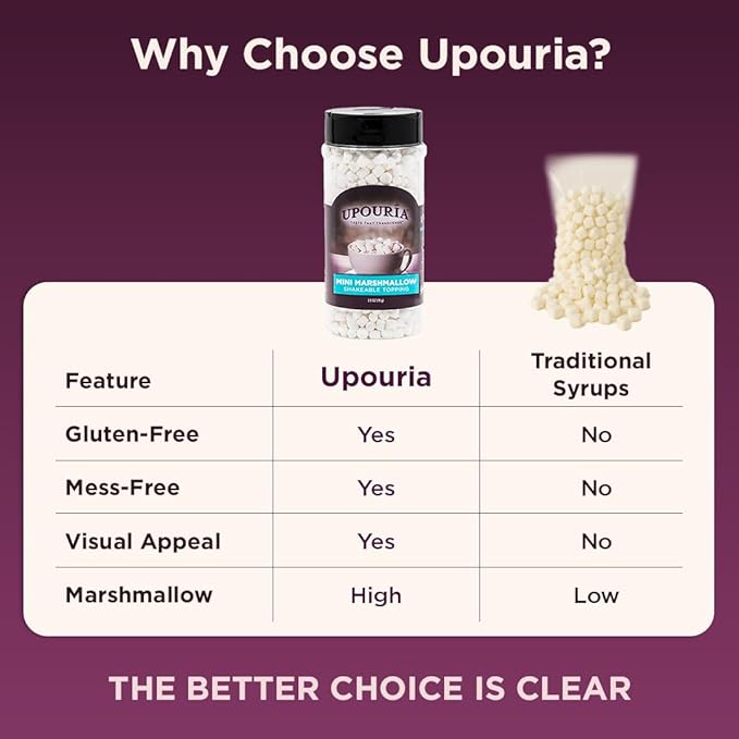 - CHOSEN FOR QUALITY, LOVED FOR TASTE: Only the finest ingredients are used in creating this premium dessert and hot chocolate topper, ensuring your beverage is enhanced with the crunchy deliciousness of upouria mini marshmallows .