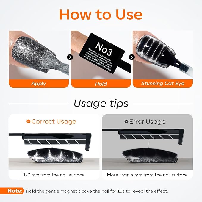 - Easy To Use:Hold the magnet 3-5mm above the surface for 15-30s to achieve your desired effect! remember to keep the magnet side facing your nails and not to touch the nail surface, then immediately put your nails in the UV light for 2 minutes or LED light for 60 seconds, you can also apply top coat to make the nail art more stable.