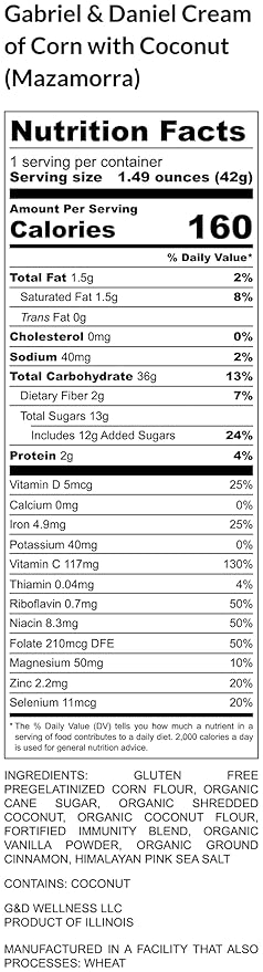 - Tropical-Inspired Comfort in Every Bowl: Start your day with Gabriel & Daniel Corn Cream with Coconut and Mazamorra, a comforting hot cereal that blends traditional Latin American flavors with organic coconut for delicious breakfast essentials