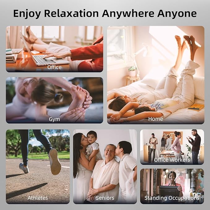 - Pain Relief and Improved Blood Circulation: Our unique acupressure nodes and massage technology help alleviate plantar fasciitis, neuropathy, muscle tension, and other pains. Designed to improve blood circulation, using the foot massager before bed can enhance sleep quality