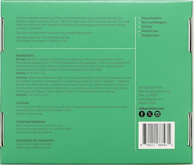 - Made in USA in an FDA-Registered & cGMP-Certified Facility, Dermatologist-Tested - This moisturizing face mask is hypoallergenic, non-comedogenic, oil-free, alcohol-free, and cruelty-free; free from parabens and propylene glycol. This collagen night mask set includes: 1 mixing spatula, 1 application brush, 8 powder sachets (4 grams each), 8 activator sachets (4 mL each), and 8 mixing bowls. This complete face mask kit contains egg (albumen) and marine-derived spicules. Patch test prior to first use and avoid use on broken or irritated skin
