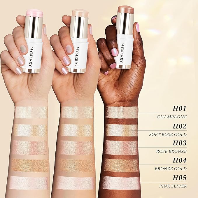 - ✨ Use On Face And Body:Multi-Use highlighter stick in a breathable,weightless texture to leave your skin (and lips!) looking dimensional and fresh. Perfect for face and body.MYMERRY provid 100% cruelty-free, fragrance-free, paraben-free and gluten-free formula.