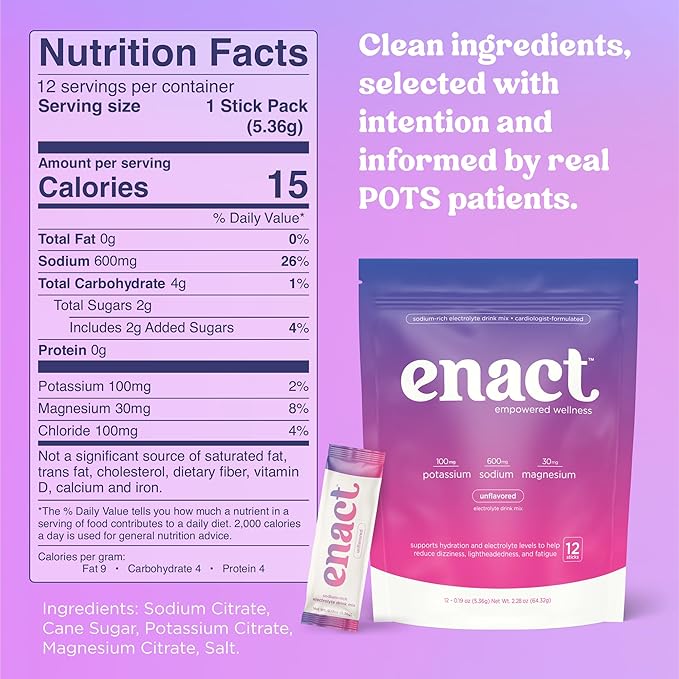 - WE’RE HERE FOR YOU. You deserve a hydration formula that truly supports you. If Enact POTS electrolyte drinks don’t help you feel stronger, steadier, and more energized, we’re here to help—no questions asked. Taste Note: You may notice the salt taste – that's the 600mg of sodium working to support your body. This is intentional and a sign that Enact is providing the electrolytes you need.