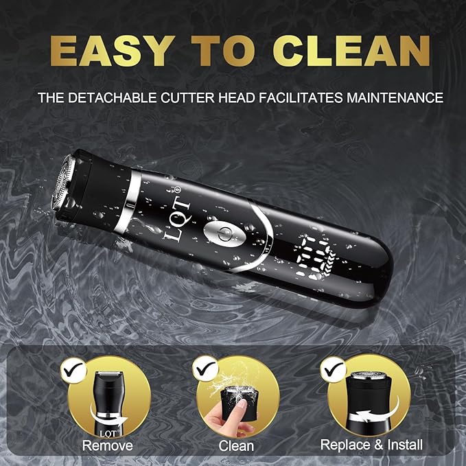 - đăWaterproof & Easy Cleaningă: The four heads of the LQT Pubic Shaver Bikini Trimmer Set are IPX7 compliant, allowing you to use it with shaving foam or dry. Its water-resistant feature makes cleaning a breezeâsimply rinse under running water (please note that the body is not waterproof).