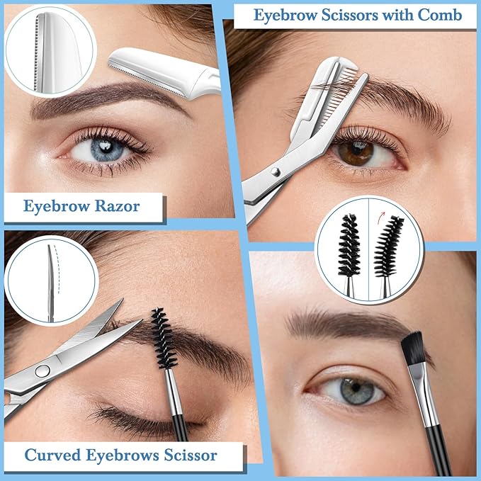 - 8 in 1 Eyebrow Kit: Our tweezers set comes with 4pcs eyebrow tweezers for women(Pointed, flat, slant&angled tweezers), 1pcs eyebrow trimmer, 1pcs eyebrow scissor, 1pcs eyebrow razor and 1pcs double side eyebrow brush. Essential Hair plucking daily beauty tools for women, perfect for shaping eyebrows, removing fine hairs, and more